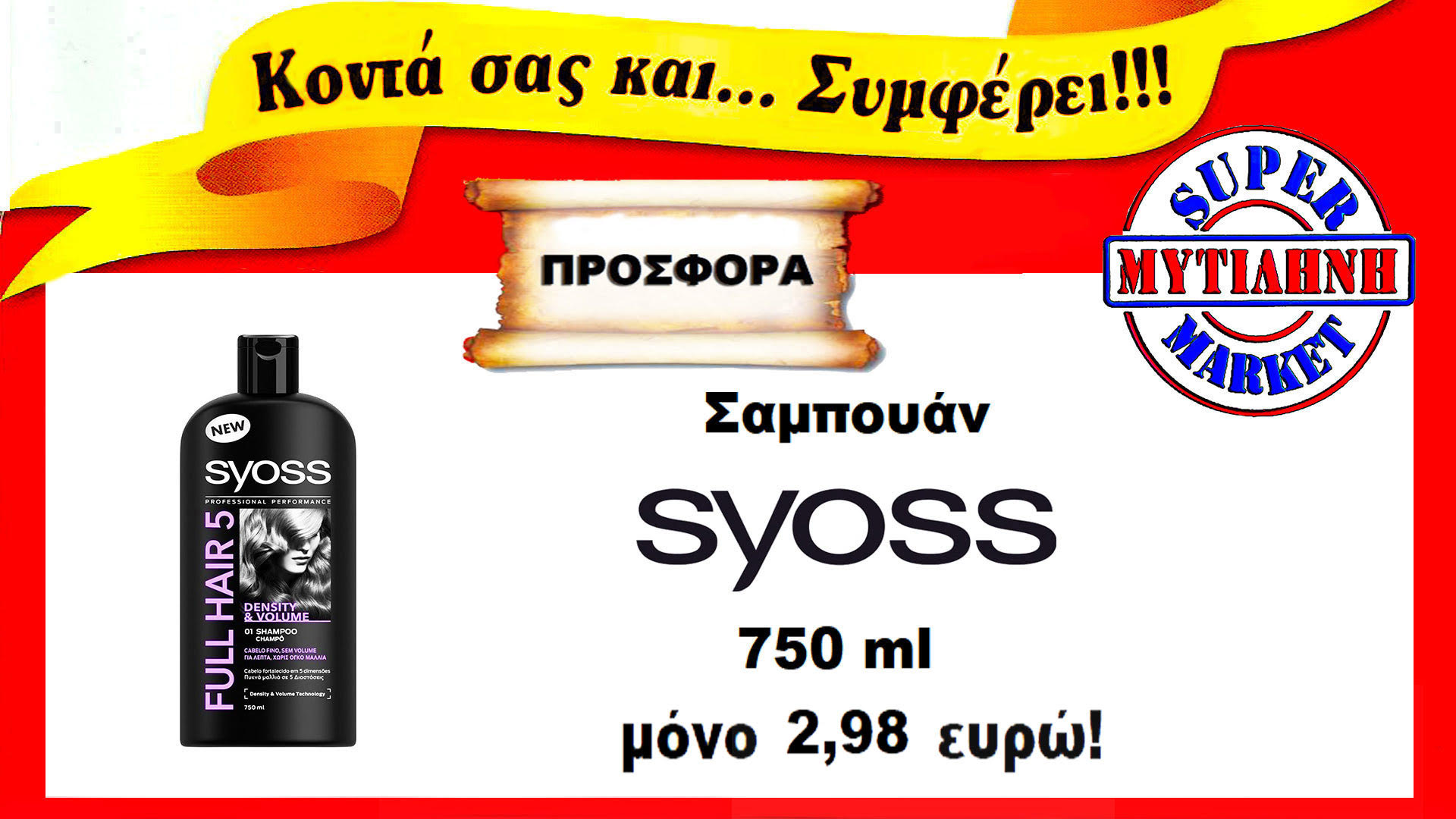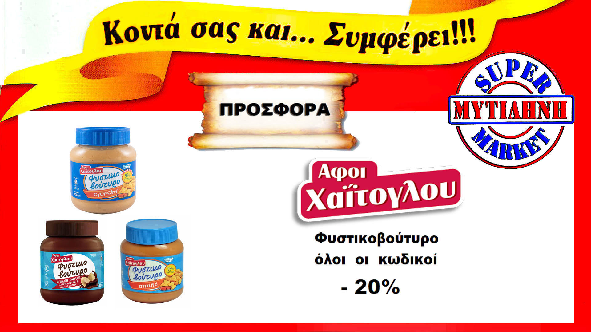 Δεν έχει να ζηλέψει τίποτα και από κανέναν στο χώρο του σούπερ μάρκετ. Πέρα από τις ανταγωνιστικές τιμές του, τις καθημερινές προσφορές, την ποιότητα των προϊόντων, την πλούσια γκάμα, τα δώρα και τις προωθητικές ενέργειες, το σούπερ μάρκετ “ΜΥΤΙΛΗΝΗ” είναι κοντά σας συνεχώς, προσφέροντάς σας την απόλυτη εξυπηρέτηση.